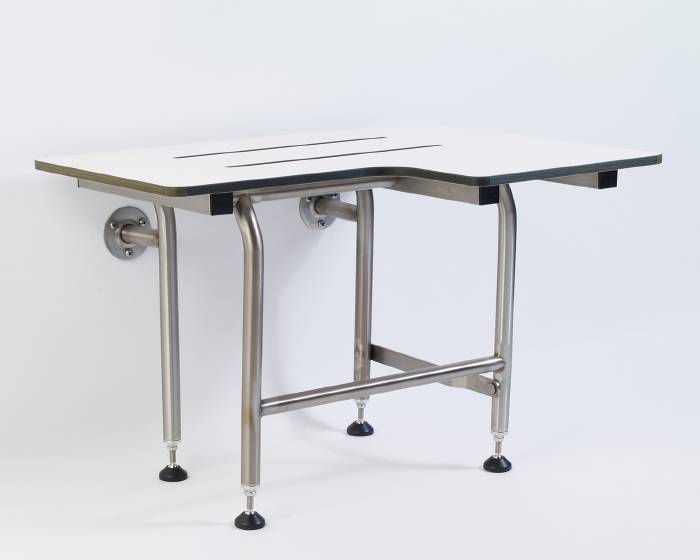 Phenolic wall mounted folding shower seat with legs – L-Shape. Made from durable white phenolic material. In stock and ready to ship today!